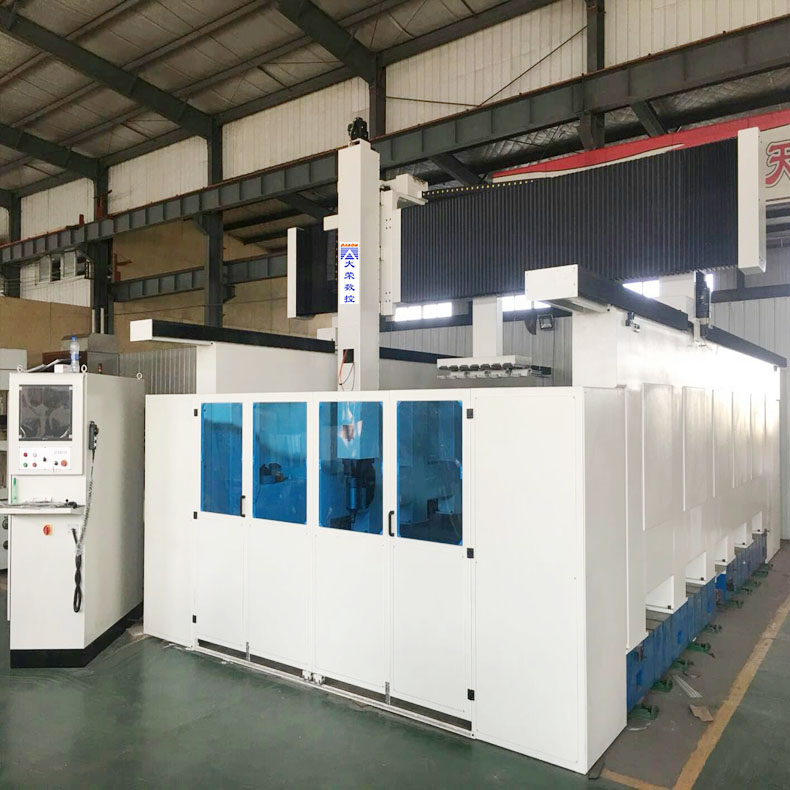 6、辅助配置:龙门加工中心工作台面可选配吸夹两用或者吸附台面,在针对不同材料加工时,应该选择适合刀具,配置冷气枪等,不建议喷水因为机床呈开放式结构,使用谁循环会将水溅的导出都是;动梁式五轴加工中心属于半包围机床状态,不加工时机床前后两端可以打开,加工时关闭可以防止碎屑溅的到处都是,更好的保护工作环境。